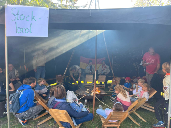 Bei strahlendem Sonnenschein und 27 Grad war unser Jurtendach im Rathauspark ein angenehmer Sonnenschutz. Trotz der zusätzlichen Wärme vom Lagerfeuer haben viele Kinder und ihre Eltern ein leckeres Stockbrot genossen. Auch das Basteln von Schlüsselanhängern und das Dosentelefon kamen gut an. Ein sehr gelungenes Fest!