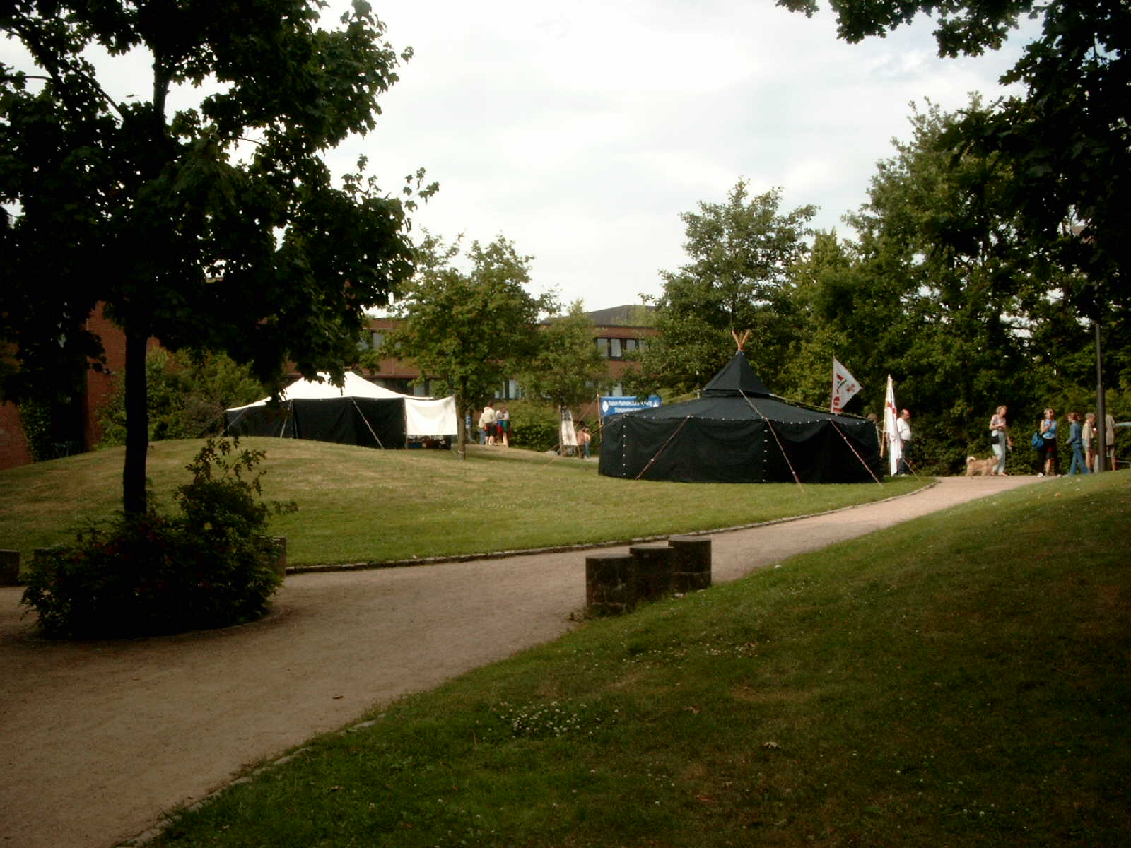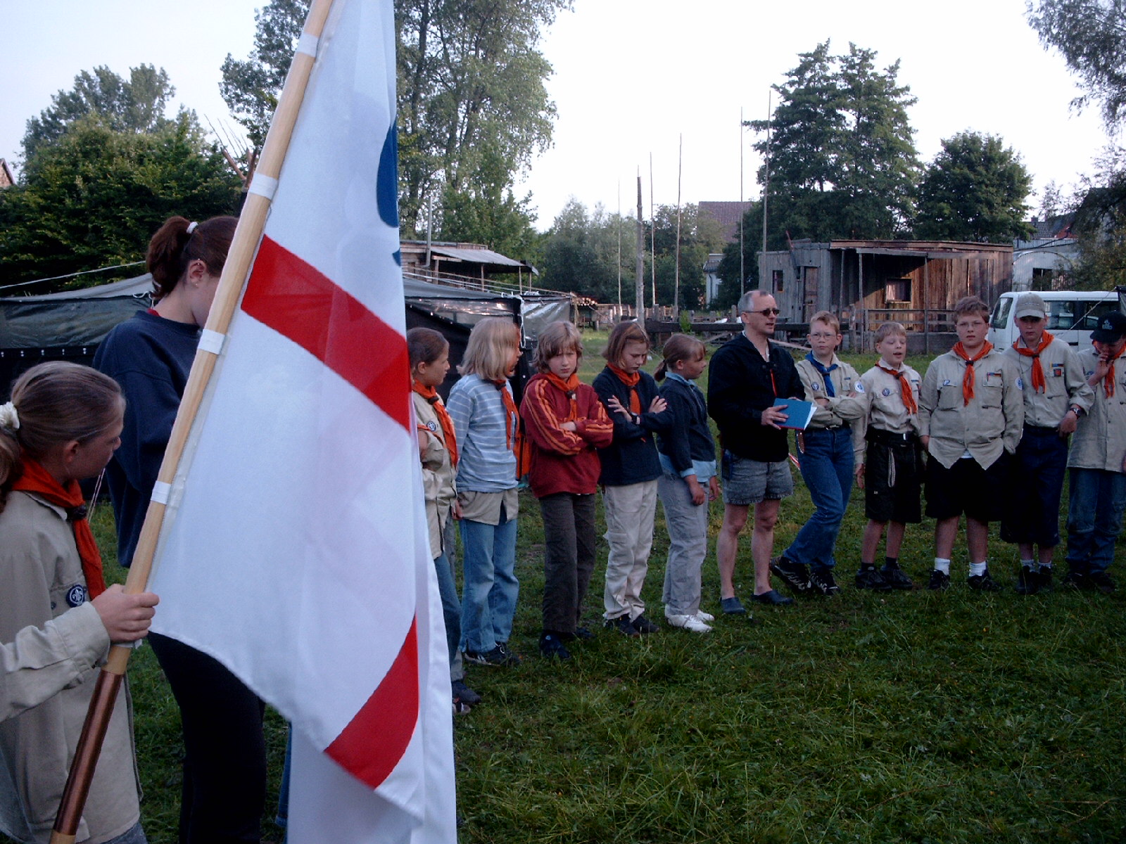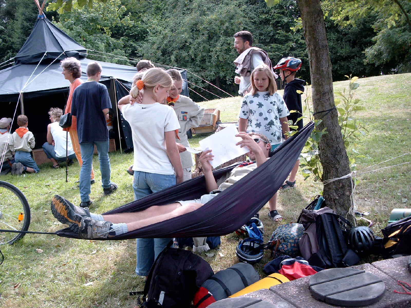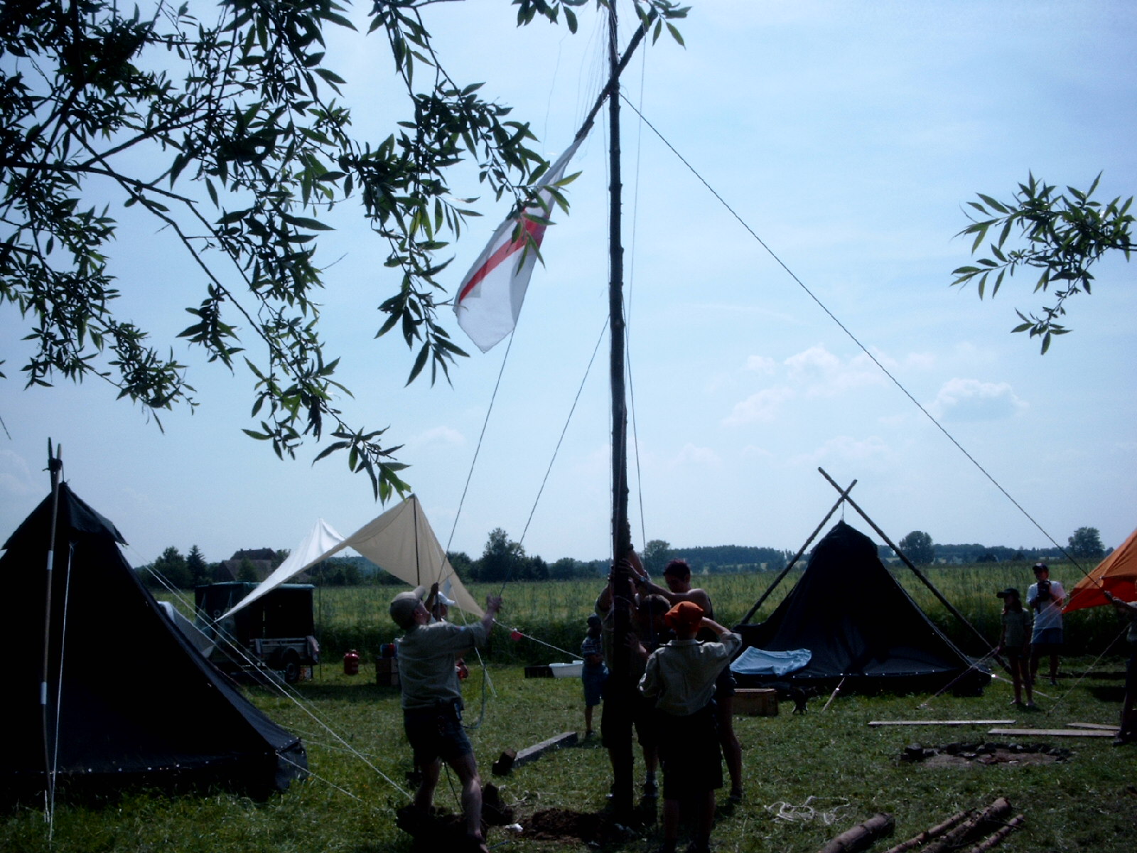 Unter dem Motto "Basiscamp" fuhren 43 Pfadfinder mit 10 Leitern und Betreuern auf die Jugendfarm nach Lemgo. Nach einer 3 stündigen Busfahrt wurden die restlichen 2 Jurten durch die Pfadis aufgebaut. Die erst Jurte, sowie 2 Kohten hatte Jogi schon den Tag über mit kräftiger Hilfe seiner Frau aufgebaut. Die erste Nachtruhe war kurz und der darauffolgende Tag sehr sonnig und heiß. So wurde im naheliegenden Bach ausgiebig gespielt und vor allem das Lager eingerichtet. Sitzgelegenheiten wurden um die ausgegrabenen Feuerstelle geschaffen, ein Bannermast aufgestellt, Sickergruben ausgehoben, Brücken über den Bach gebaut und vieles Weitere mehr. Nach einem zünftigen Abendbrot bei Grillwurst und Salat, wurde am Lagerfeuer noch Versprechen gefeiert und Lieder bei Gitarrenspiel gesungen, ehe die Nachtwache ihren Dienst antrat.