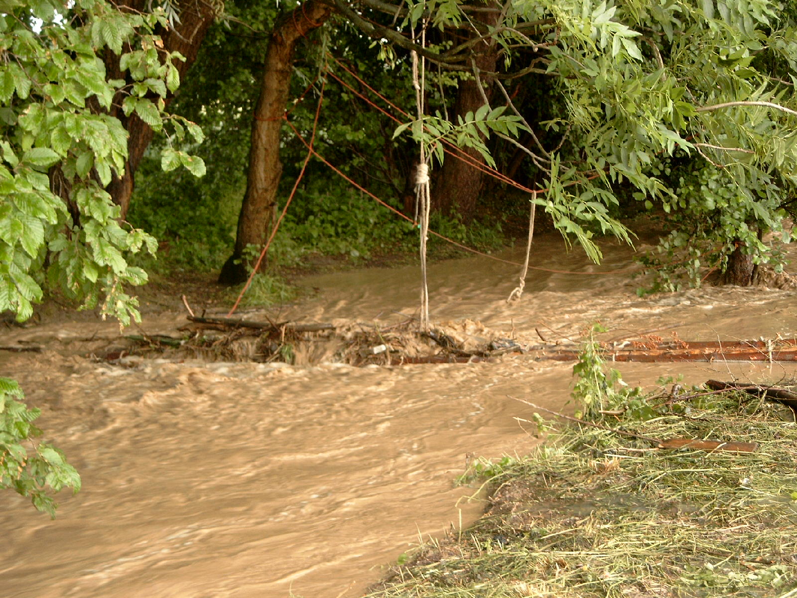 Am Sonntag wurde unter Leitung der Kuratin Gabriele Kief der Pfingstgottesdienst gefeiert. Erste Wolken ließen ein Ende des schönen Wetters erahnen. Während des Mittagessens begann es dann zu regnen. Erst nur so viel, dass Alle in die Zelte gebeten wurden. Kurz danach stand schon Wasser auf der Wiese, bis dann der nahegelegene Bach rasch über die Ufer trat. Der Platz wurde bis auf die Zelte geräumt und die Nacht auf einem Strohboden verbracht