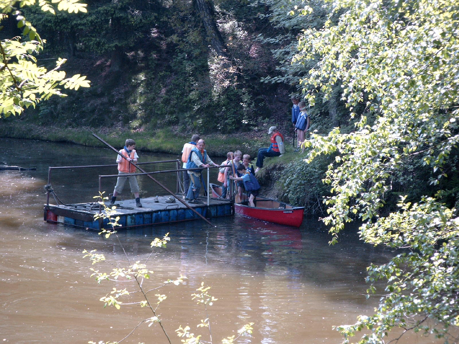 Lagerleitung hatte dieses Jahr Cat. Zur Lagerrunde wurde dann am nächsten Morgen geblasen. Simon hatte seine Trompete in den Dienst der Sache gestellt. Zur "Freude" aller. Zum Leiterteam gehörten neben den Gruppenleitern auch Kinder als Stufensprecher für die jeweilige Stufe. In der Runde wurde der Tagesablauf besprochen und dann ging es los. Es wurden einige Lagerbauten vorgenommen, Holz gehackt und .... dann war da noch der natürliche See mit einer kleinen Insel. Das mitgebrachte Kanu und ein vorhandenes Floß waren ständig ausgebucht. Mit diesem Andrang hatten das Leiterteam und der "Seebeauftragte" Ulli nun wirklich nicht gerechnet. Aber ein Pfadi währe kein Pfadi, wenn sie sich nicht zu helfen gewusst hätte. Schnell haben sie aus vier Tonnen, einigen Brettern und Seilen ein zusätzliches Floß gebaut und los ging es.